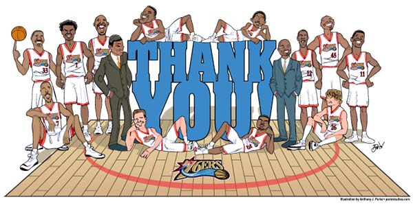 Thank you card showing a caricature of the Philadelphia 76ers for season ticket holders.